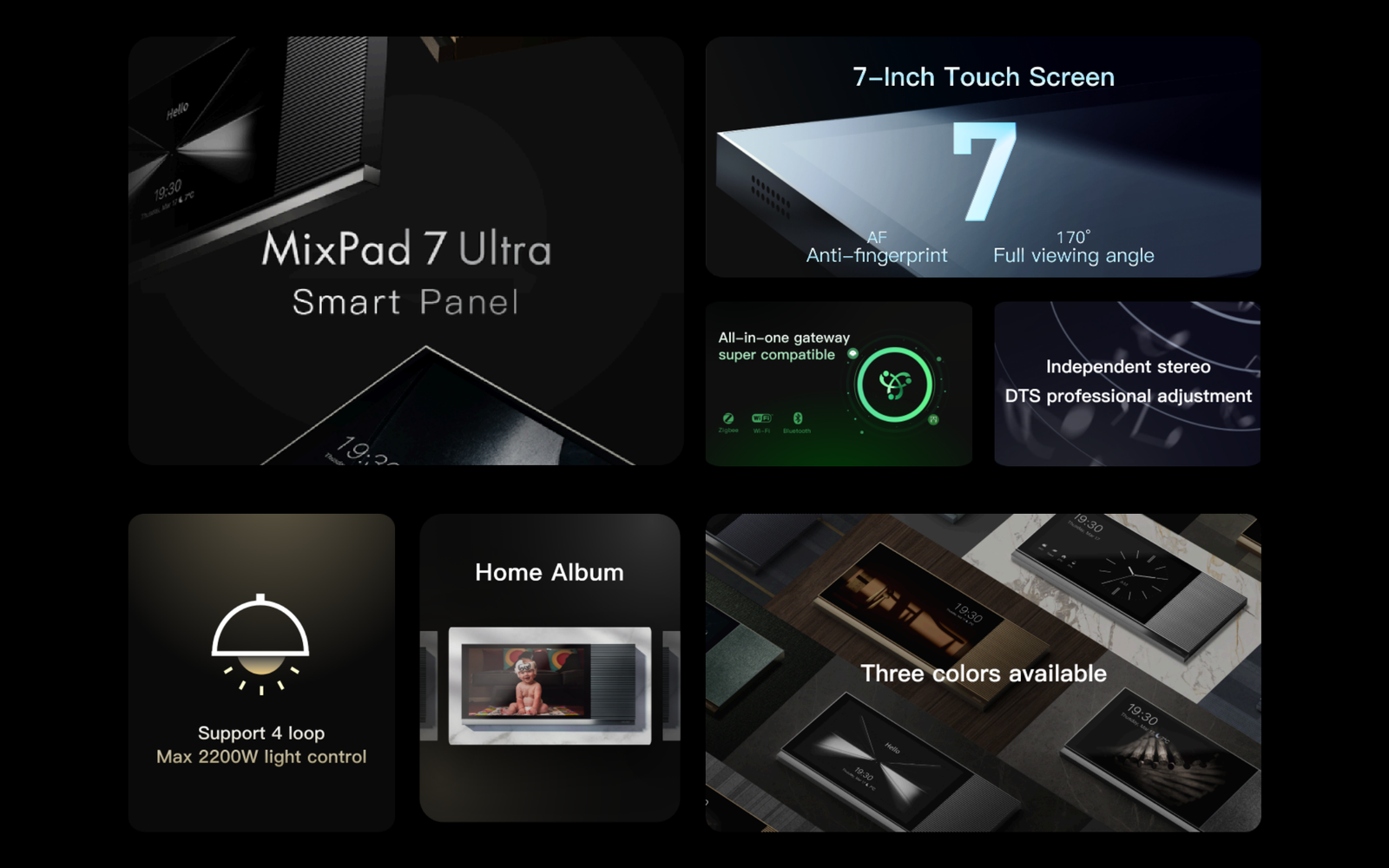 MixPad 7 Ultra Large Central Control Screen Super Home Album Personalized display of pictures in the rest screen Specifications Product MixPad M5 Dimensions 3.39 * 3.39 * 1.51in Power Supply 220~240V, 50/60Hz Mounting Type Surface Mount Communication Protocol WiFi 2.4GHz / 5GHz, Bluetooth, Zigbee Material Plastic Load Type LED, CFL, IL, etc. Load Range Max 400W L1/L2 gang, Max 200W L3/L4 gang Voice Control Works with Alexa Operating Environment Temperature 32°F ~ 113°F, humidity ≤90%Rh